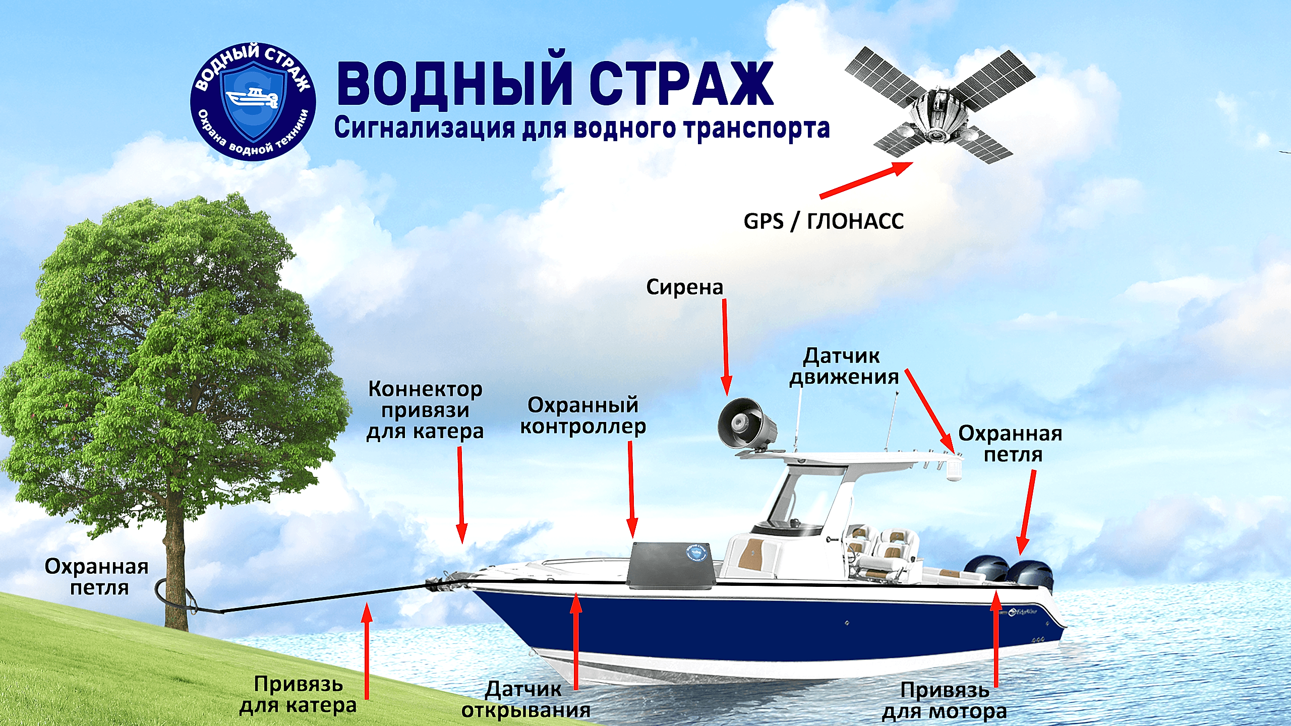 Под охраной:Рундук с АКБ и «Пин Ап» (за счет датчика открытия), непосредственно самосудно (за счет охранного кабеля), мотор (за счет охранного кабеля).